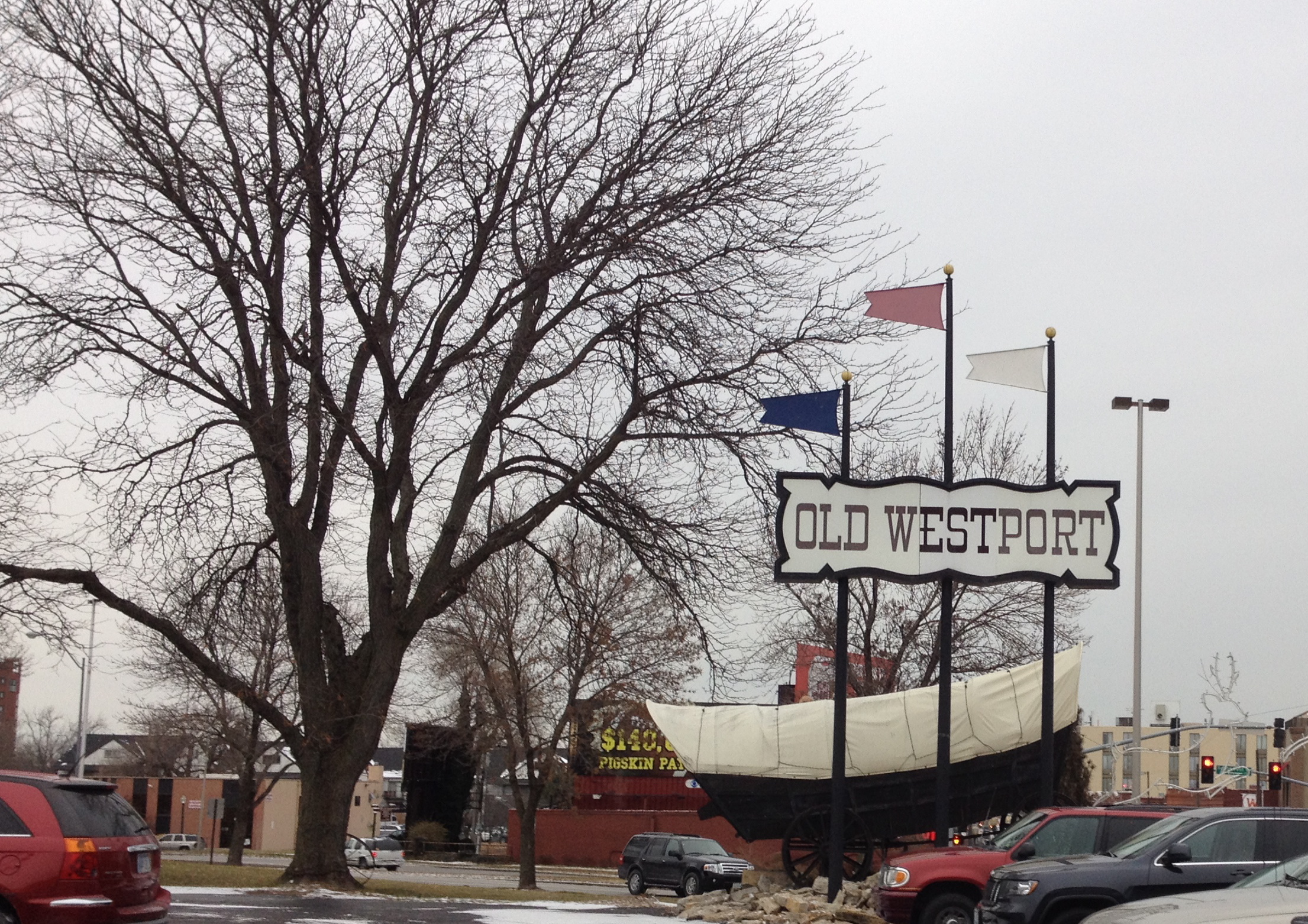 Old Westport sign at the corner of Westport Road and the trafficway.There are no tall buildings in Westport. At the corner of Southwest Trafficway and Westport Road, an old wagon is preserved under the ‘Old Westport sign.’ Although, the streets are quiet during the day, the days of gun-toting renagades are not necessarily gone. I was out shopping and saw a man bend over to pick up his toddler, and out poked his hand gun. At night, sounds of emergency sirens and train whistles echo. There are occasional gun shots in the night.